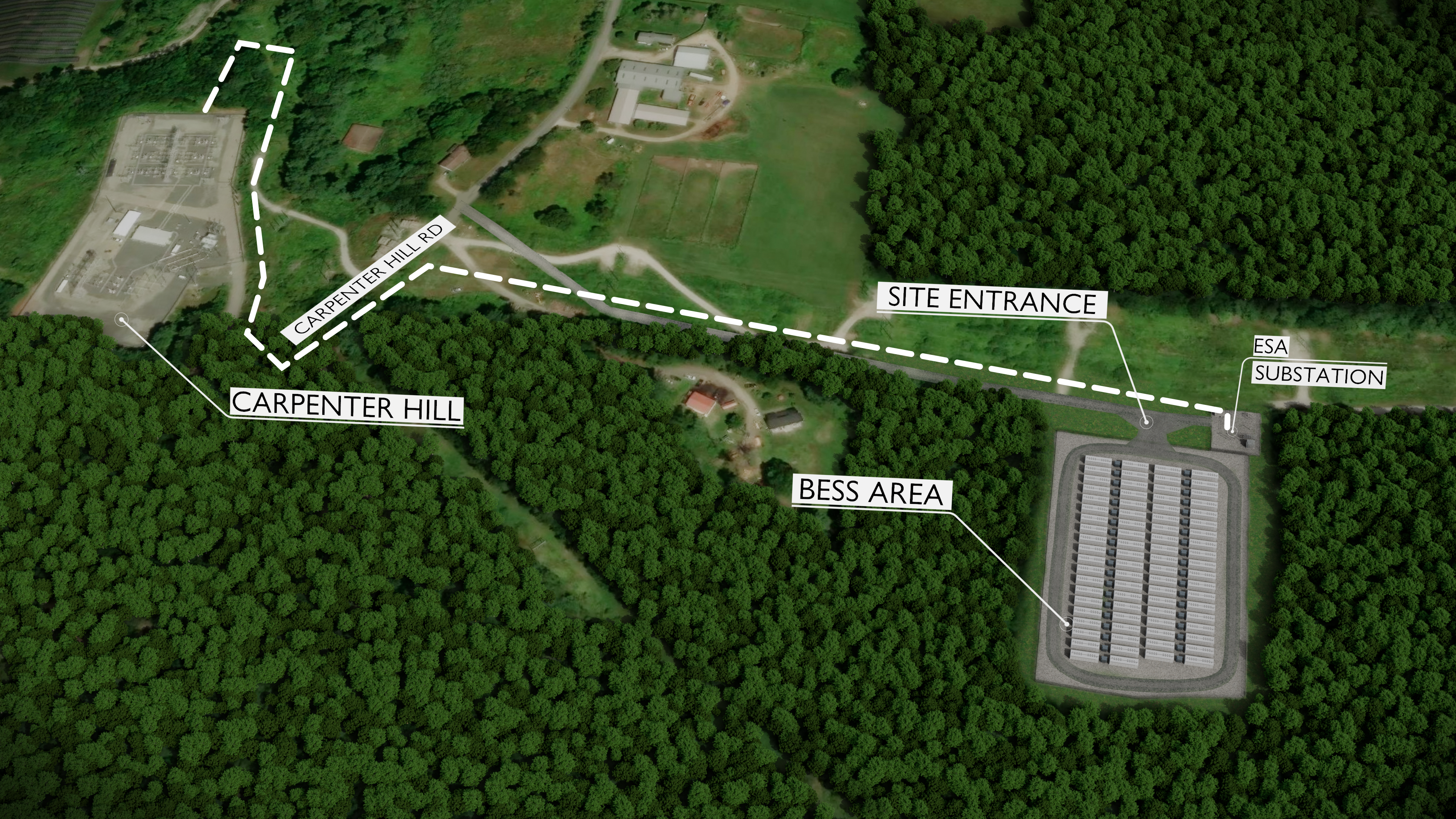 A battery energy storage system — a field of large rechargeable batteries on Carpenter Hill Road in Charlton, right next to the existing electrical substation. They store electricity when the grid has too much and release it when there's not enough. Think of it like a giant version of the battery in your phone, but for the whole region's power supply.